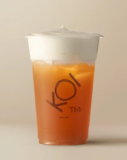 A fruity drink prepared with peach green tea & a creamy cheese foam topping