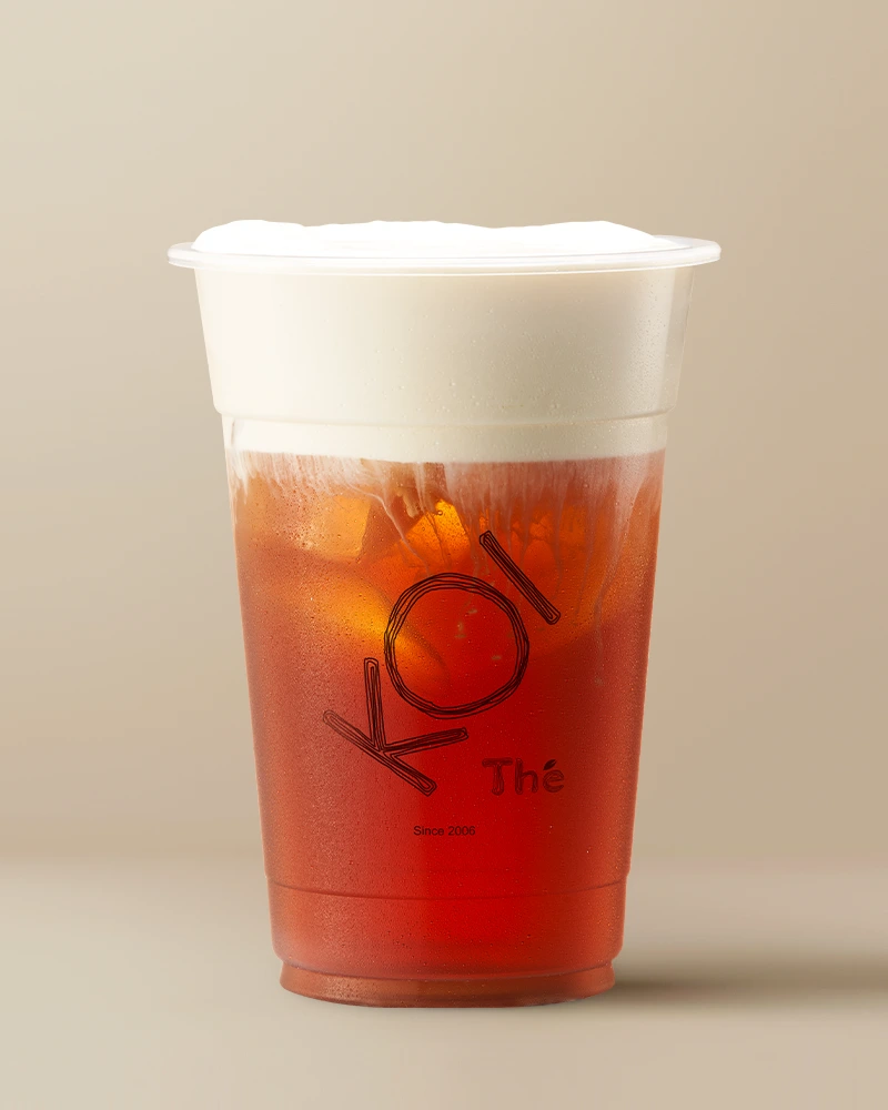 A sweet drink prepared with black tea, caramel & a creamy cheese foam topping